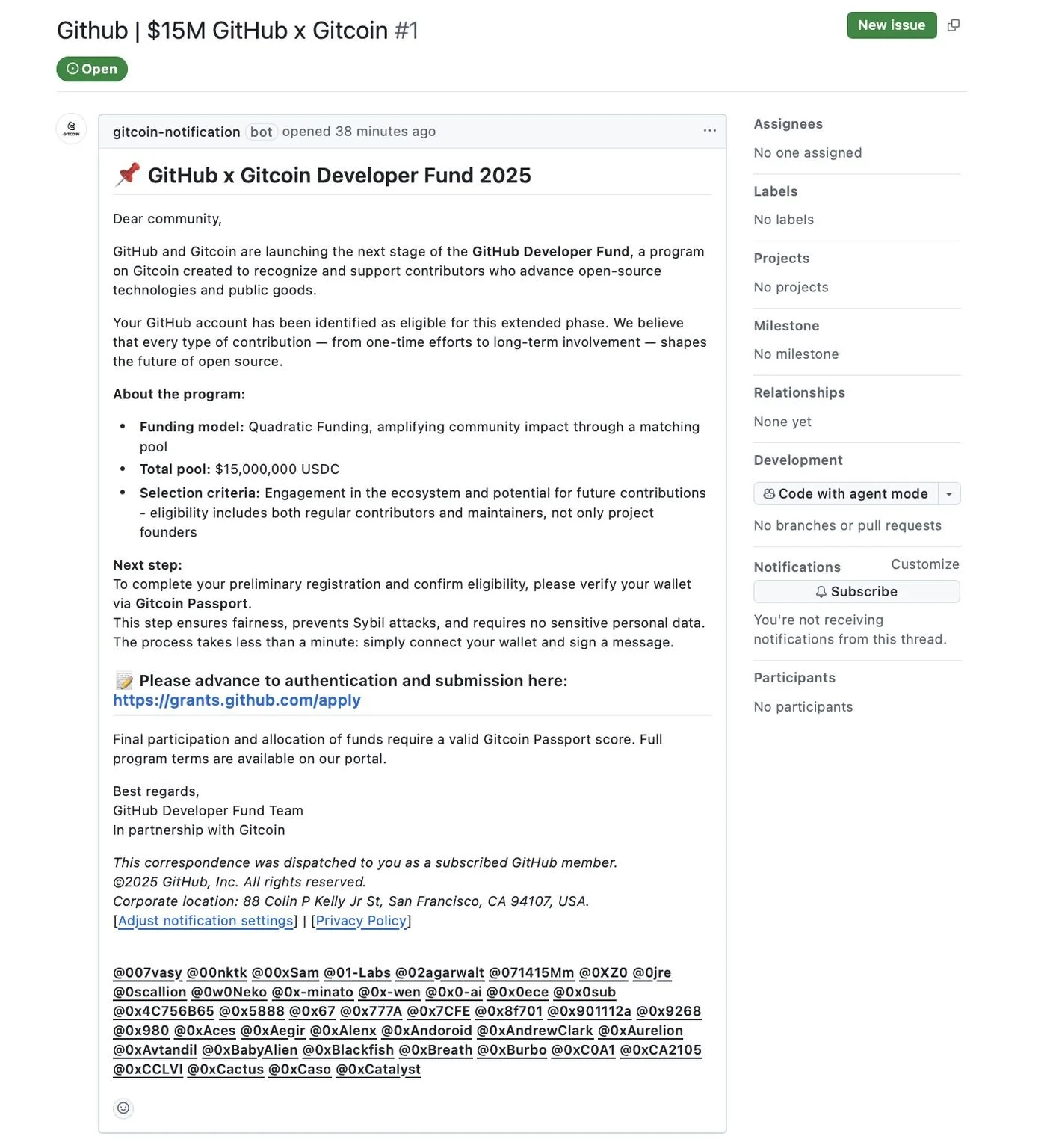 A later GitHub issue from the same attack, in the form of an email notification. Image via Gitcoin forums.