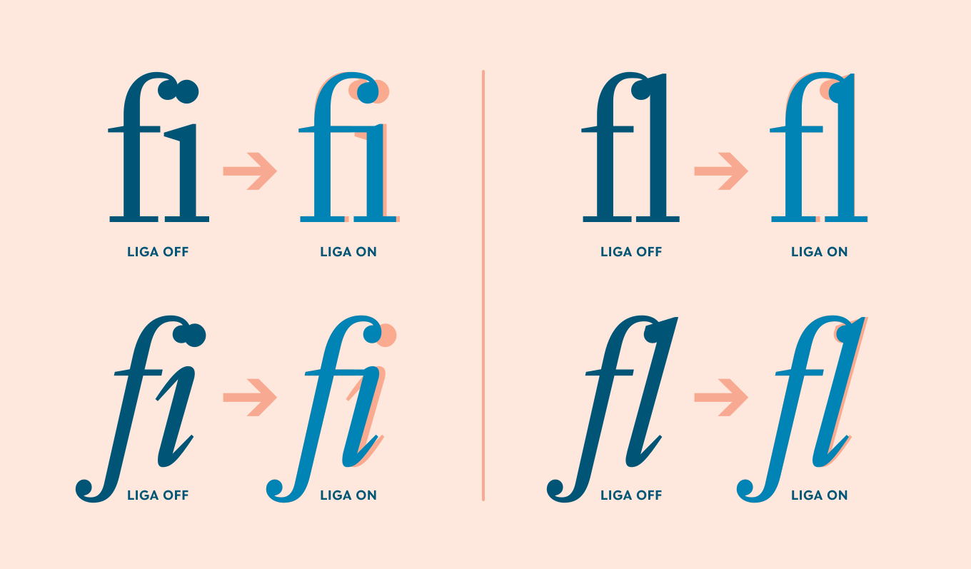 Font ligatures are a feature of digital typefaces, typically used to fix issues with certain combinations of letters. For example, overhanging “f” might collide with a following “i” or “l”; font creators can set a ligature that replaces the ugly collision with a prettier glyph.