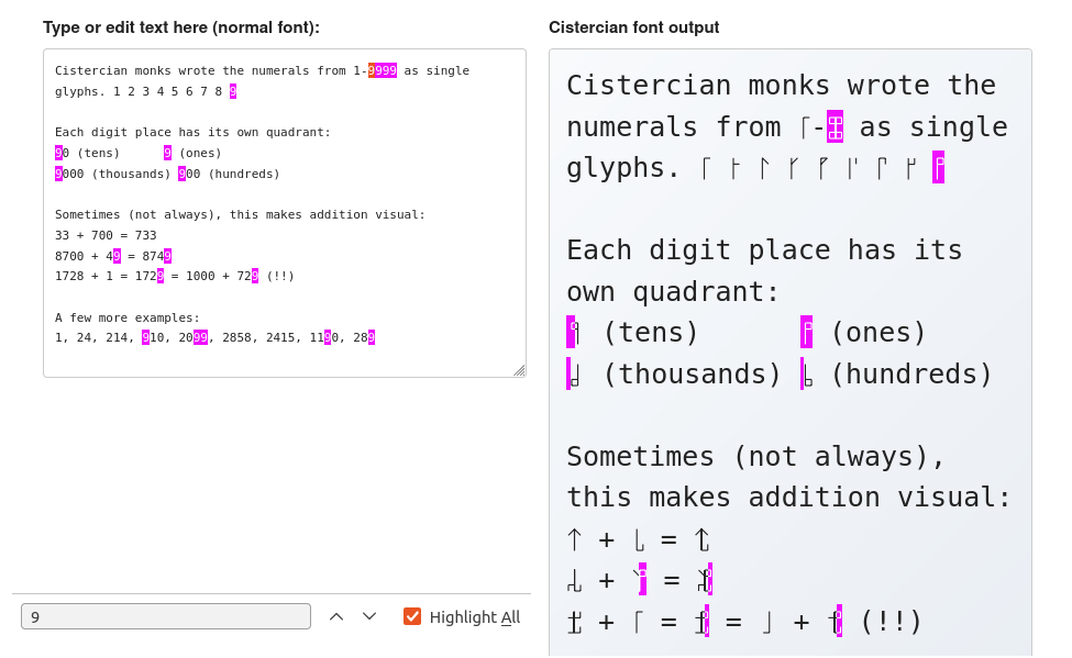 This means that by replacing your default fonts on your browser, you can get Cistercian numerals everywhere! Why would you want to do that? Anyways…